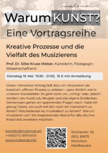 19. Mai 19:30, Dieser interaktive Vortrag lädt dazu ein, Musizieren als einen kreativen, offenen Prozess – ganz ähnlich wie in unserem Kunstatelier – zu erleben. Es geht nicht um „richtig“ oder „falsch“, sondern um Ausdruck, Neugier und das eigene Entdecken.